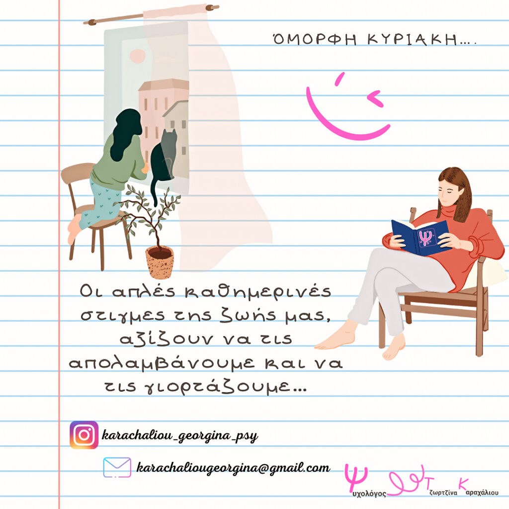 Ανακαλύπτοντας τις μικρές χαρές που προσφέρει η καθημερινότητα, όπως ένα χαμόγελο από έναν άγνωστο, ένα ωραίο ηλιοβασίλεμα ή ένα νόστιμο γεύμα, ένα ωραίο βιβλίο…